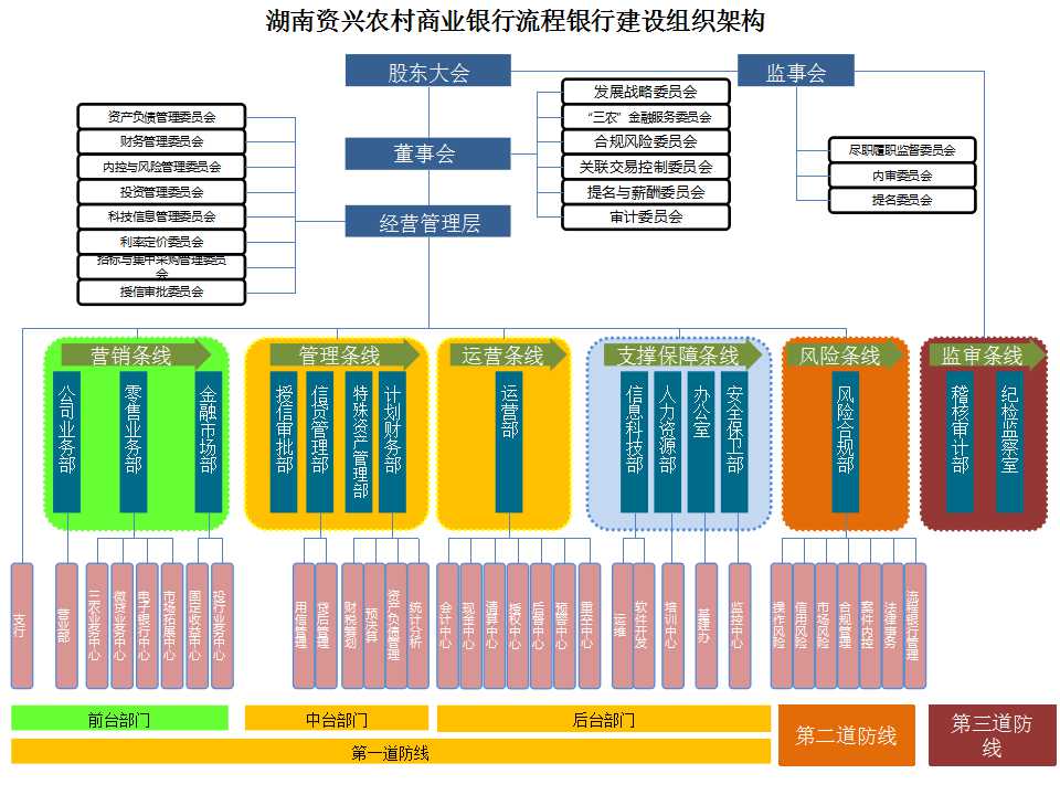 根据建设流程银行的总体要求,此次组织架构优化调整以总行机关部室调整为核心,新设授信审批部真正实现审贷分离;合并市场拓展部、电子银行部为零售业务部,更好适应市场竞争的需要;新设运营管理部,将网点柜面业务、操作风险管理等职能从计划财务部中剥离出来,管理更为规范科学。调整后的组织架构实现了法人治理科学化、前台营销专业化、中后台管理集约化、风险管理规范化、岗位职责明晰化五大目标,标志着流程银行建设迈出关键性的一步,为该行今后的健康可持续发展打下坚实基础。