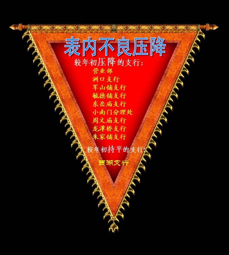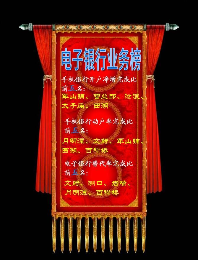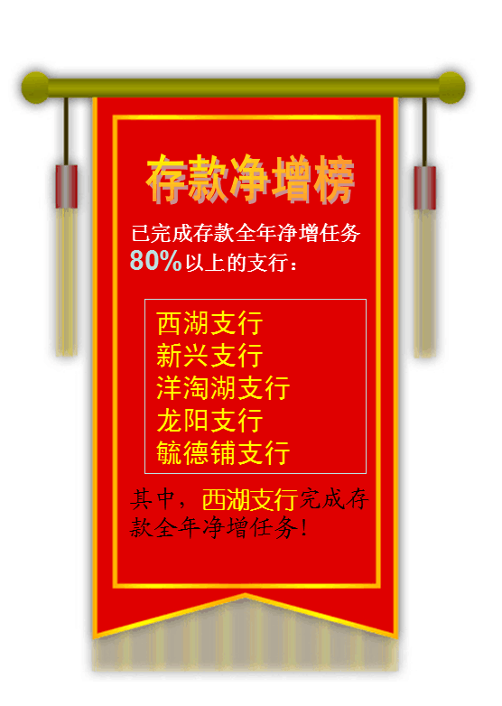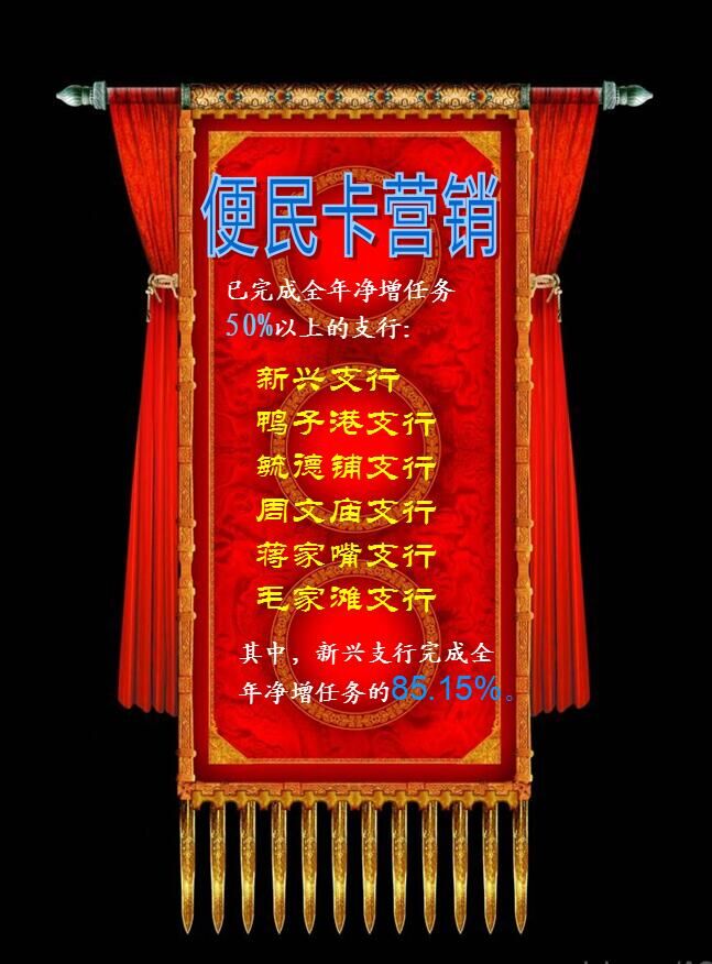 为强力推进各项业务工作发展,确保圆满和超额完成全年工作目标和任务,该行于5月中旬以发文的形式明确:从二季度开始,每季度增设五个综合奖、三个进步奖、三个便民卡营销奖,并对综合奖和进步奖授予流动红旗,按季流动,同时给予一定的物质奖励。在工作会上,该行专项对上半年便民卡营销任务完成前三名的新兴支行、鸭子港支行、毓德铺支行颁发荣誉证书,对上半年综合考核进步度最大的毓德铺支行、周文庙支行、蒋家嘴支行进行表彰和颁发流动红旗,对上半年综合考核排名前五的毓德铺支行、龙阳支行、军山铺支行、周文庙支行、小南门分理处进行表彰并颁发流动红旗。