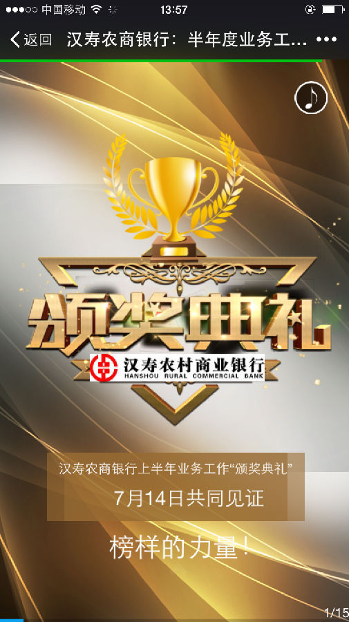 7月中旬,在汉寿农商银行半年度工作会议召开后,该行结合会议重点内容和议程,精心制作了一期题为《“半年度业务工作”颁奖典礼》的易企秀电子简报,并通过行内高管群、农商银行群等进行广泛转发,不到一个小时,点击量达600余次。营造了全行员工“明工作重点、晓工作思路、找工作短板、学先进典型”的良好氛围。