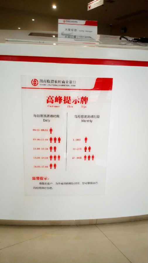 近日,临澧农商银行安福支行营业大厅内在进出口醒目位置张贴了一块“高峰提示牌”,吸引了不少前来办理业务客户的目光,并得到了广大客户朋友们的好评和点赞。提示牌上,标注了该网点每月、每日的客流高峰时段,便于客户参考,提醒客户合理安排时间,避开业务办理高峰期,有效帮助客户节省等候时间。