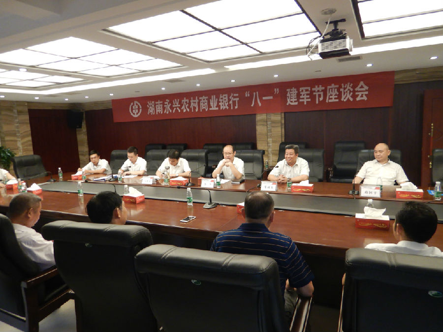 7月31日,为纪念建军90周年,永兴农商银行在二楼会议室举行了“八一”建军节座谈会。行领导班子及18名退伍军人参加座谈会。