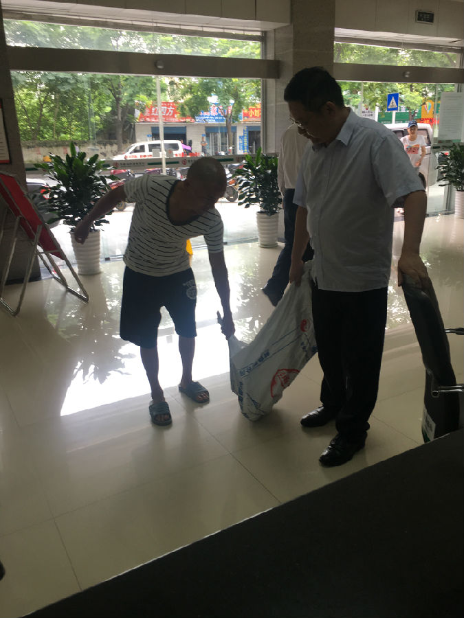 14日上午九点,只见一男一女吃力地将两个装着东西的蛇皮袋移向常德农商银行东江支行营业厅,正在大厅安排工作的行长唐勇询问后,和大堂经理一起帮着将袋子抬进大厅。