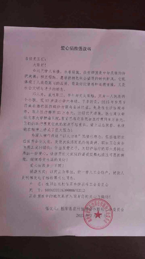 病痛无情人有情。近日,桂阳县联社发起了对患癌员工邓六秀的募捐活动,共募集善款4万余元。