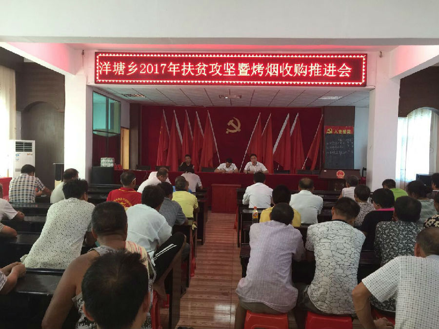 8月8日上午,永兴农商银行洋塘支行联合当地政府召开洋塘乡2017年扶贫攻坚暨烤烟收购推进会议,支行行长罗攀、乡政府副书记李军运、烟草站站长廖永祥、各村村支书、村主任以及当地149名烟农参加了会议。