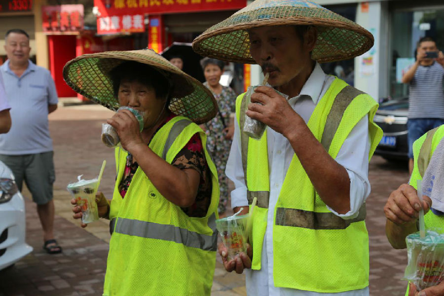 活动当天,该行纪委书记陈曙波同志带领相关工作人员到现场向奋战在高温一线的中心城区环卫工作者们表示衷心感谢并致以了亲切的问候,同时还送去了绿豆、白糖等一批价值5万元的清凉解暑物品。活动现场,我行还将在总行食堂精心熬制的一批绿豆汤和银耳莲子汤,送到了环卫工人代表们手中。