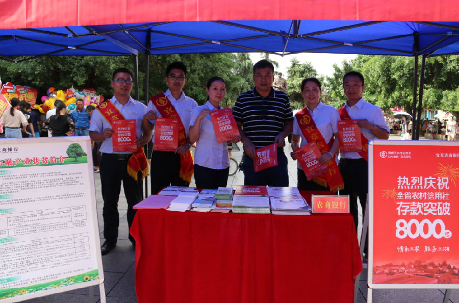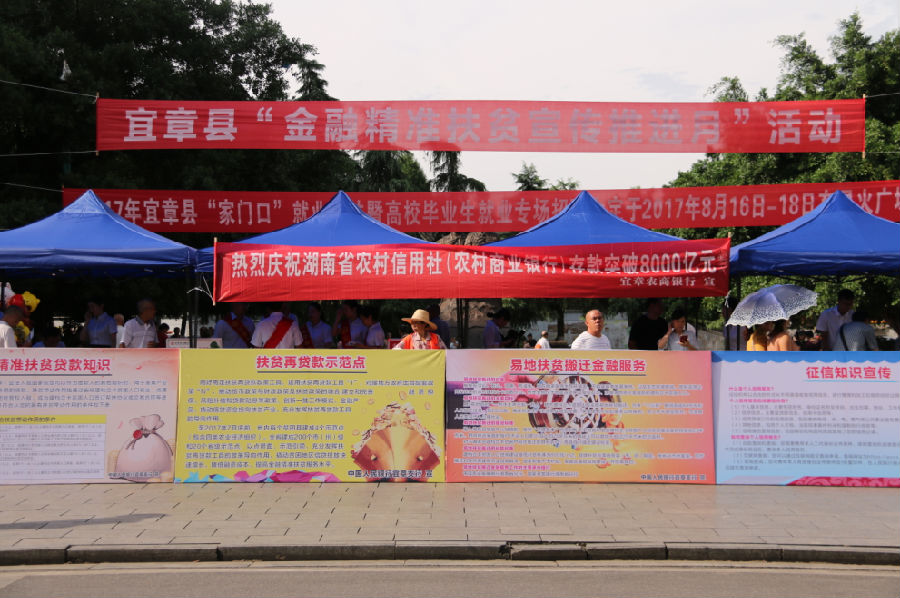 8月14日上午,宜章农商银行在星火广场开展“金融精准扶贫宣传推进月”集中宣传活动。