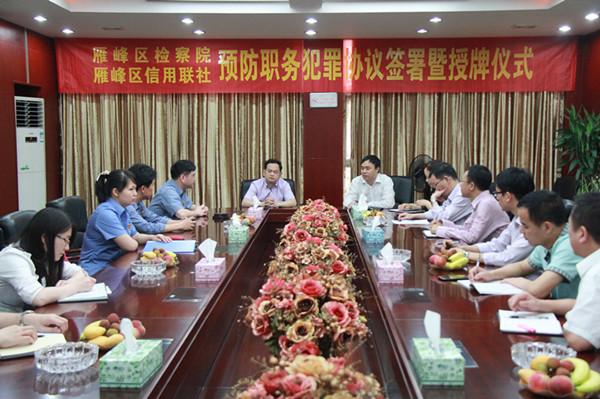 5月30日,衡阳市雁峰区联社与区检察院共同签署了预防职务犯罪合作协议,并成立了“预防职务犯罪工作联络室”。这标志着雁峰农信与区检察院联手开展预防职务犯罪工作机制的形成。 根据协议要求,预防职务犯罪工作联络室将开展法律咨询、法制宣传和警示教育等工作,并参与联社大宗物资采购、工程招投标等重大事项的同步监督工作。同时,雁峰区联社还与区检察院建立了联席会议制度,每年至少召开一次例会,重点研究预防职务犯罪中存在的问题、工作重点与措施等内容。
