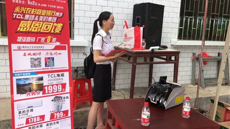 “点钞机、保险箱、捆钞机、插线板、宣传单、宣传海报……”清点好东西,永兴农商银行柏林支行的三名员工便赶往柏林镇二甲村,为村里8月17号的通乡公路募捐大会进行现场金融服务。