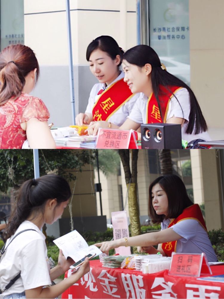 与此同时,星沙农商银行精心准备了反假货币手册及宣传折页,在来往行人流量大的深业睿城小区及黄兴镇开展户外宣传活动,向过往行人、员工、路边小摊贩主发放宣传资料,讲解人民币手感触摸、水印观察、工具检测等鉴别方法;同时进行现场讲解。为激发群众参与热情,并活动现场推出扫二维码抽奖活动,群众现场扫描关注"星沙农商银行"公众号和"反假小超人"公众号,即可获得精心准备的礼品,吸引了不少群众前来参加,现场气氛十分热烈。