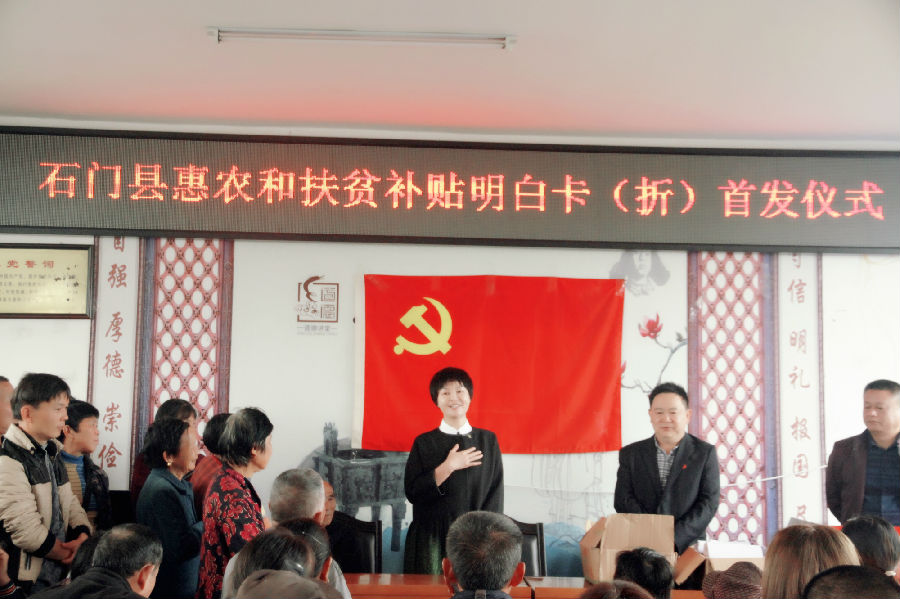 在仪式上,石门农商银行党委委员、副行长王春华作了惠农补贴“一卡通”明白折的详细介绍:惠农补贴“一卡通”明白折是在原有的惠农补贴存折(卡)的基础上增发的惠农补贴明白折和扶贫补贴明白折,是一种专门用于记录普惠制惠农补贴和建档立卡贫困户扶贫补贴项目、金额发放明细的存折,每笔补贴发放时会实时向提供手机号的农户发送免费短信提醒,方便老百姓了解自己惠农补贴的来源和支出,不具有金融交易和存取款功能。
