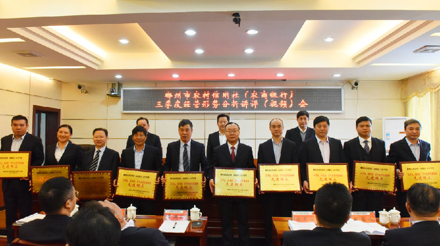 李永丰副主任宣读了《关于表彰郴州市农村信用社(农商银行)“压不良、控风险”百日攻坚竞赛活动先进行社、先进网点、清收能手的通报》,通报表彰了百日攻坚竞赛活动中临武农商银行等3家“先进单位”、郴州农商银行苏仙支行营业部等10家“先进网点”、汝城农商银行陈飞翔等30名“清收能手”以及嘉禾联社胡干生等3名“特别贡献奖”。办事处领导为获奖单位和个人代表颁发了奖牌。