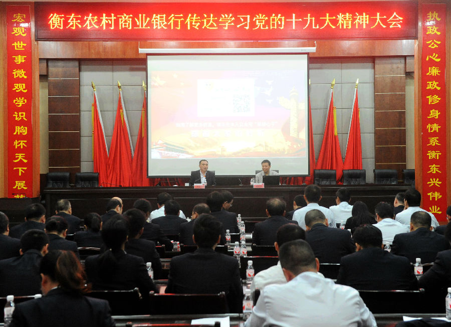 11月10日,衡东农商银行在衡东县委党校报告厅召开传达学习党的十九大精神大会。衡东农商银行党委班子成员、副协理员、行长助理、各部门负责人、各支部书记、各支行行长及全体党员共计130余人参加。