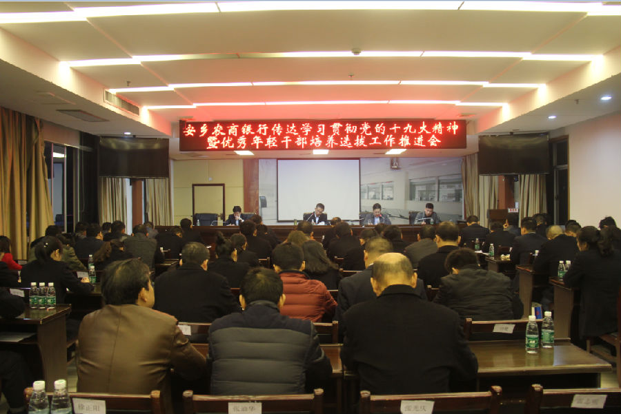 11月13日,安乡农商银行召开学习贯彻党的十九大精神暨优秀年轻干部培养选拔工作推进会。总行党委班子成员、行长助理、协理员、部室经理、机关全体党员,各党支部书记、支委成员,支行行长共计80余人参加会议。