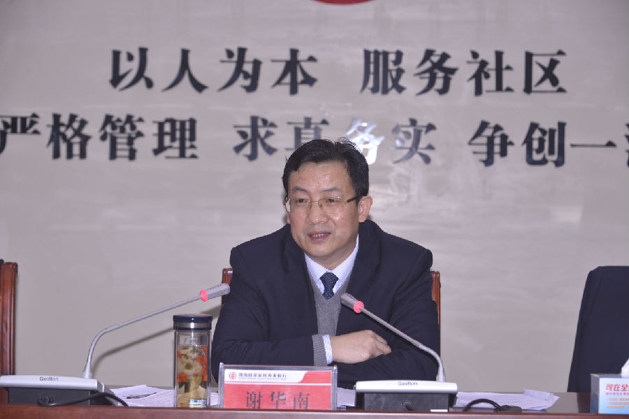 在学习贯彻党的十九大精神大会中,该联社党委书记、理事长谢华南作讲话,他首先带领大家深入学习了新时代坚持和发展中国特色社会主义十四条基本方略中的其中两条方略,要求紧跟党走,坚持党对一切工作的领导;文化自信,坚持社会主义核心价值体系。然后,他结合该联社实际,以坚持服务乡村振兴战略为例,就习近平新时代中国特色社会主义思想具体落实到工作实践中,讲了三点意见:一是要坚持服务乡村振兴战略,当好农村金融的主力军;二是要坚持全面深化改革,建立现代农村商业银行体系;三是要坚持全面从严治党,提高干部员工的思想站位和工作能力。
