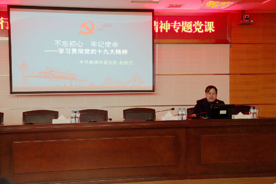 为及时准确把握党的十九大精神,勉励广大党员不忘初心,牢记使命,不断提振精神状态,改进工作作风、提升工作效能,11月21日,湘潭农商银行邀请中共湘潭市委党校赵湘芝教授作了题为《不忘初心 牢记使命——学习贯彻党的十九大精神》的主题党课,帮助广大党员深刻领会习近平新时代中国特色社会主义思想的历史地位和丰富内涵。党委班子成员,支行行长、副行长,部(室)总经理、部(室)副总经理等70余人参加了党课学习。