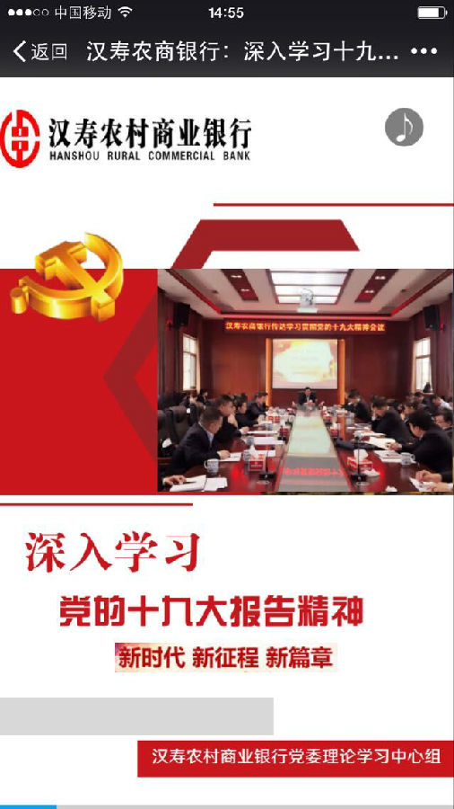 当前,汉寿县上下掀起宣传学习贯彻党的十九大精神的热潮。汉寿农商银行将学习宣传贯彻党的十九大精神,当成该行各级党组织、广大党员和干部员工的首要政治任务,并通过“三个结合”,积极做好党的十九大精神的宣传工作。
