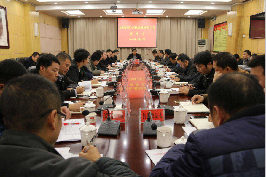12月7日上午,宜章县扶贫小额信贷清收工作调度会在政府大楼六楼常委会议室召开。县委副书记傅景龙、副县长尹旭东,以及县政府办、县政法委、县扶贫办、县法院、县检察院、县公安局、县财政局、县食药工质局、县国税局、县地税局、人民银行宜章支行、各乡镇等部门和单位的主要负责人,宜章农商银行行长助理曾华、信贷管理部总经理和开办了扶贫贷款业务的26个支行行长参加了会议。