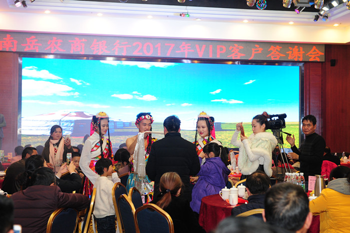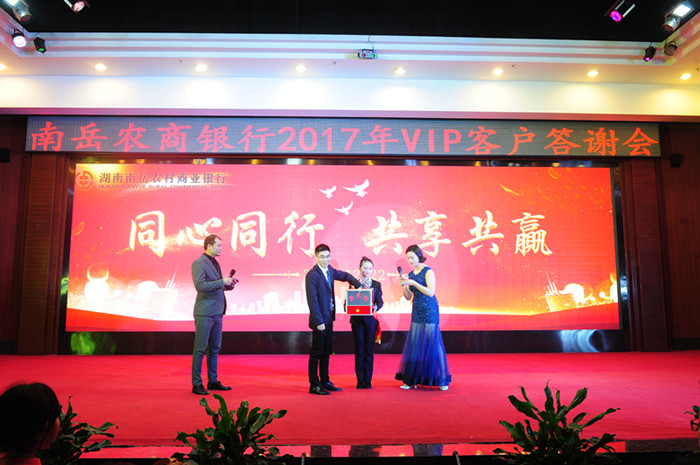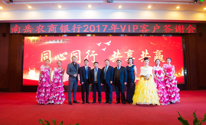 为感谢和回馈VIP客户多年以来对南岳农商银行的支持与厚爱,增进与客户之间的交流互动,12月22日晚,以“同心同行 共享共赢”为主题的南岳农商银行三周年VIP客户答谢会在逸山逸水酒店隆重举行,全行员工及VIP客户共200余人参加。