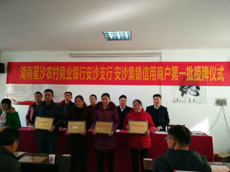 12月19日上午,星沙农商银行安沙支行“一行一品-集镇信用商户”授牌仪式在安沙社区会议室举行。 安沙镇政府党委委员、纪委书记肖钢,安沙社区支部书记黄广能,星沙农商银行业务发展部总经理段文慧以及安沙支行管理团队出席了授牌仪式,现场为第一批获得荣誉的20家信用商户授牌。