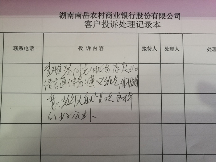 近日,南岳农商银行新村支行收到了一份特殊的“投诉”。 一位年逾古稀的老人在《客户投诉处理记录本》“投诉记录”一栏写下了这样几行字:“李雅琴同志服务态度好,语言通俗易懂又和气,我很满意,老年人就喜欢这样的好公仆。”直让人有些哭笑不得。