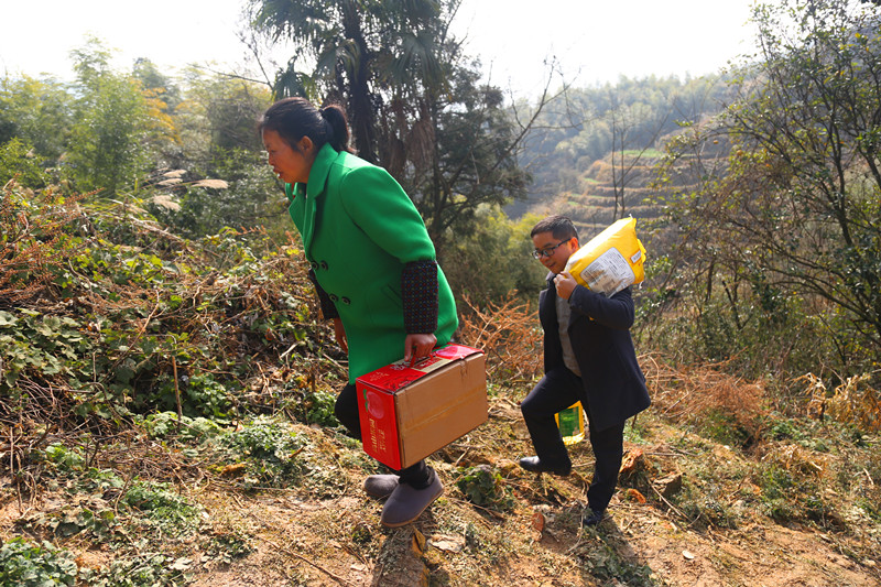 “小心点哦,这个泥巴路打滑,真是难为你们了,这大冷天的给我们送物资。”在怀化洪江龙船塘瑶族乡4组的泥泞小路上,贫困户蒋大姐关切地提醒洪江农商银行工作人员注意路面情况,别摔倒了。