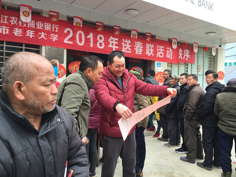 为回馈新老客户,营造欢乐喜庆的春节氛围,2月4日-11日,湖南洪江农村商业银行特邀洪江市老年大学4名书法协会的会员,利用赶集日在硖洲支行、沙湾支行、托口支行等8个网点开展了2018年送春联活动,现场创作优秀书法作品并免费赠送,将新年祝福送到每一位客户手中。