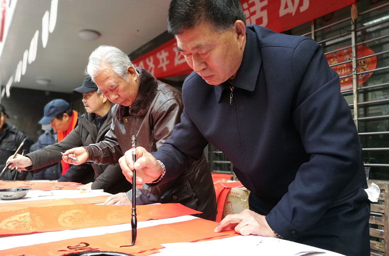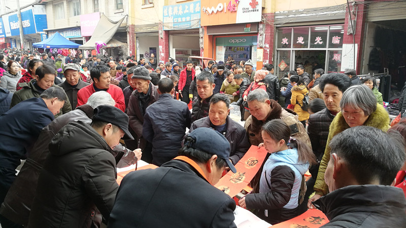 每一个活动网点的书法桌边,都簇拥着许多赶集的老百姓。“家里的老屋场是四合院,每年都要贴很多幅春联。这几位老前辈字写得漂亮,我想请他们帮我都写几幅。”一位客户拿着春联笑呵呵地说道。