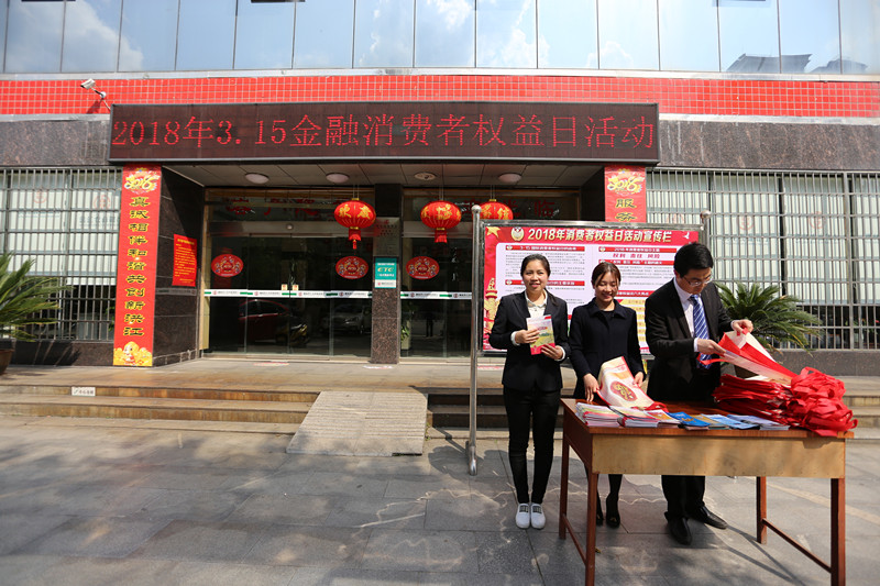 为贯彻落实党的十九大精神和全国金融工作会议精神,向广大市民普及金融知识,增强金融消费者的风险防范意识,湖南洪江农村商业银行于3月15日在总行营业部门口开展了“2018年3.15金融消费者权益日”宣传教育活动。