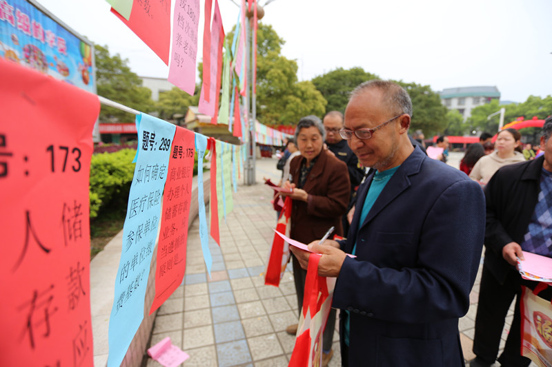 活动现场气氛热烈,老年腰鼓队、宣传横幅、落地海报、鲜花气球等把现场妆点得热闹非凡,吸引了大量市民前来观看咨询。尤其是由600来道关于社保惠民和金融类相关知识的题目组成的五颜六色的答题墙吸引了大家驻足思考,老年人比对着手里的宣传资料寻找答案,年轻人则干脆拿出手机进行搜索,查找出答案后就认真地写到答题卡上,兴冲冲地去领奖台兑换小礼物。