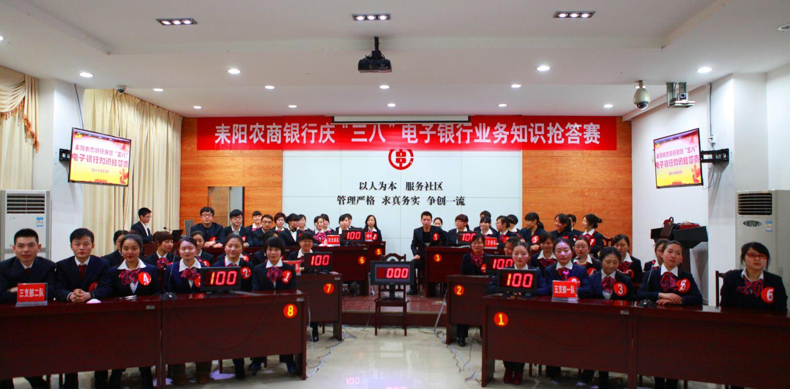 3月7日,为纪念“三·八”国际劳动妇女节104周年,耒阳农商行组织举办“三行一通”业务知识抢答赛,来自辖内48个基层网点的48名女选手组成8支队伍参加了比赛,该行领导班子、部门总经理、支行行长共68人现场观摩。