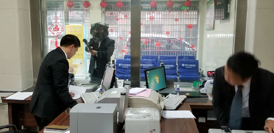演练中,一蒙面歹徒手持武器进入营业大厅,并快速走到2号营业窗口,要求柜员将现金放入收纳袋中。柜员在口头警告歹徒的同时,迅速按下报警装置。会计主管及时向总行监控中心报告突发情况。在歹徒猛砸防弹玻璃之际,两名营业柜员快速锁上票箱和钱箱,快速飞奔进入金库室。赶来施救的警务人员和联防人员合力将歹徒制服。