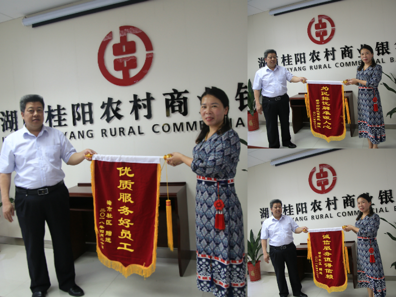 5月2日,一位特别的客户来到桂阳农商银行总行办公室,手里拿着三面锦旗,高兴地说道:“我是塘市社区的工作人员,受塘市老百姓委托,为塘市农商行送锦旗来!”紧接着,将塘市支行近两年来柜面服务质量的大幅提高以及客户满意度的明显提升进行了真心实意地夸奖。该行相关负责人热情地接待了这名来访者,并代表塘市支行收下了锦旗。
