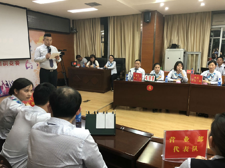 二、预决赛制,层层选拔。此次竞赛活动采取预、决赛制,5月1日和5月2日分别由辖内五家支行和机关人员组成的代表队共六支参赛队伍进行小组预赛,每场预赛的前三名共六支队伍进入5月3日晚上的决赛,经过紧张激烈的比赛,准备充分、基础扎实、团队协作力强的队伍才能脱颖而出,在决赛中角逐出了一等奖、二等奖和三等奖得主。