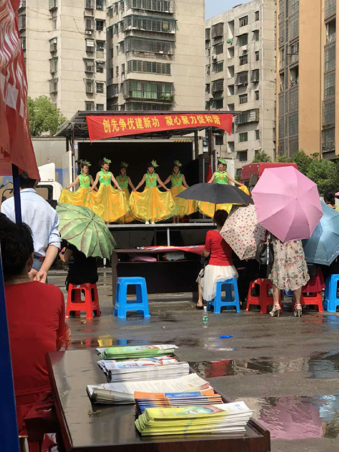 一是搭建舞台“唱大戏”。由社区党总支部策划、珠晖支行党支部承办,组织支行员工和社会群众文艺队,在社区群众集中、地面空旷的位置搭台演出,用歌舞和朗诵等群众喜闻乐见的表现形式,演绎了《唱支山歌给党听》《没有共产党就没有新中国》《歌唱祖国》等革命歌曲和优秀诗词,让广大群众在欢心欣赏文艺节目的同时,在心灵上再次接受革命的洗礼,现场掌声不断、笑声连绵。