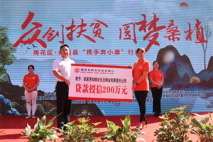 6月27日,桑植众创空间服务中心启动仪式在桑植举行。在启动仪式上,桑植农商银行为众创空间入驻企业代表“知蜂谷”现场授信200万元,助力大众创业,赢得阵阵掌声。