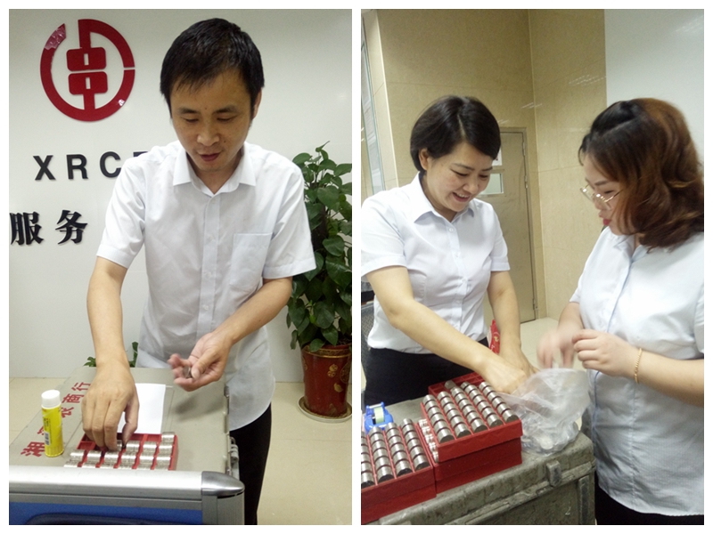 为了尽快帮助客户存款,在不影响正常柜面服务的前提下,九华支行迅速成立了4人组成的临时清点硬币小组,支行行长也参与进来,大家分工协作,对硬币进行整理、成堆、清点、复核、扎捆。两个小时过去了,工作人员的手指都被硬币上的金属色染黑了,这些一元人民币整整齐齐的摆放在营业部地面上。经清点,硬币一共有13183枚,合计13183元。