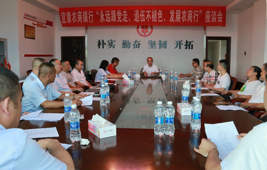 “咱当兵的人,有啥不一样,只因为我们都穿着朴实的军装……”,一曲高亢有力、激情澎湃的军歌齐唱拉开了宜章农商银行“八一”座谈会的序幕。7月31日下午,在建军节91周年来临之际,宜章农商银行召开以“永远跟党走、退伍不褪色、发展农商行”为主题的座谈会,党委书记、董事长李平,党委委员、副行长邓树模及16名退伍军人、1名军嫂参加了座谈。
