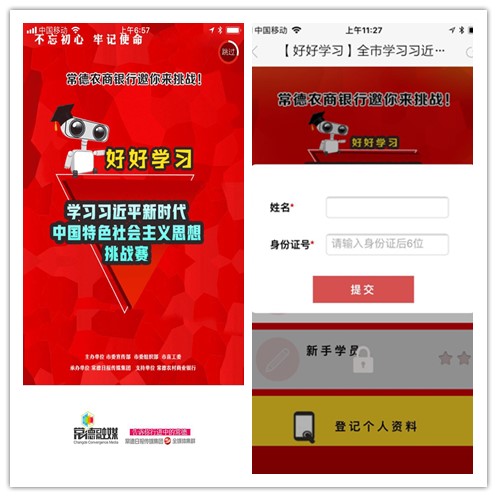 常德融媒开机第1页、新手学员注册页面显示“常德农商银行邀你来挑战”
