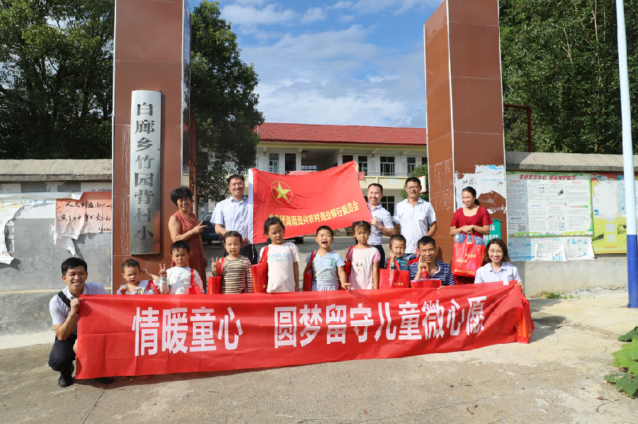 9月18日,资兴农商银行团委组织10名青年员工深入资兴市白廊镇东江湖库区及龙溪山区4所学校开展“情暖童心,圆梦留守儿童微心愿”活动,为50名在读的农村留守儿童、农民工子女及其他需要帮助的儿童送上爱心物品。