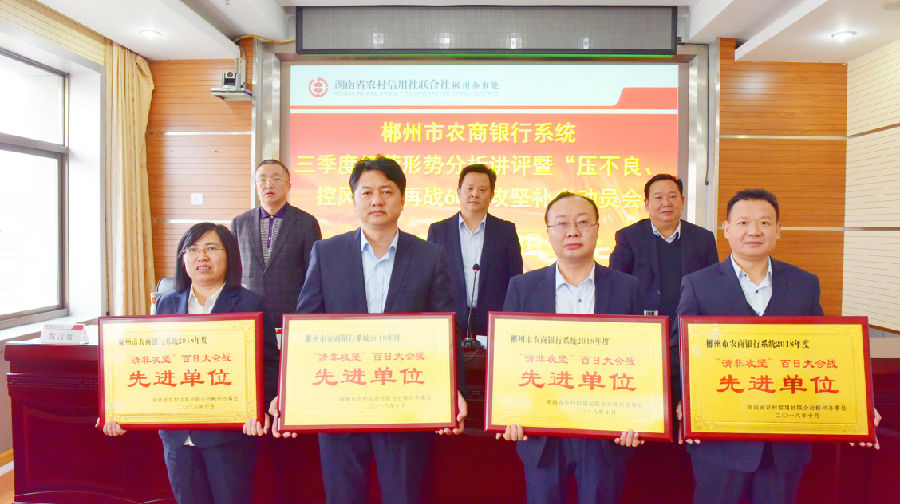肖帆宣读了《关于表彰全市农商银行系统2018年“清非攻坚”百日大会战活动先进单位和清收能手的决定》。办事处领导为桂东、永兴、临武、嘉禾4家获奖农商银行进行了颁奖,并为全市30名清收能手颁发了荣誉证书。