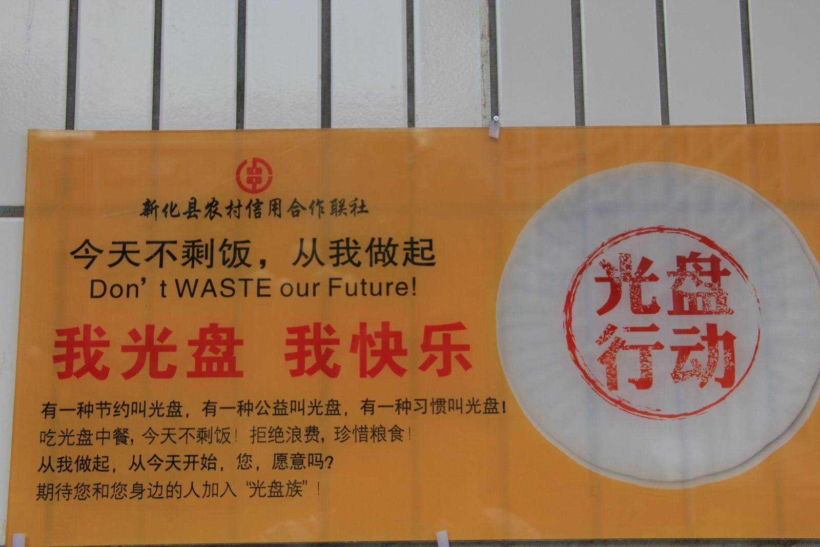 “有一种节约叫光盘,有一种公益叫光盘!所谓光盘,就是吃光你盘子中的食物。拒绝浪费,珍惜粮食!从我做起,从今天开始,你,愿意吗?”