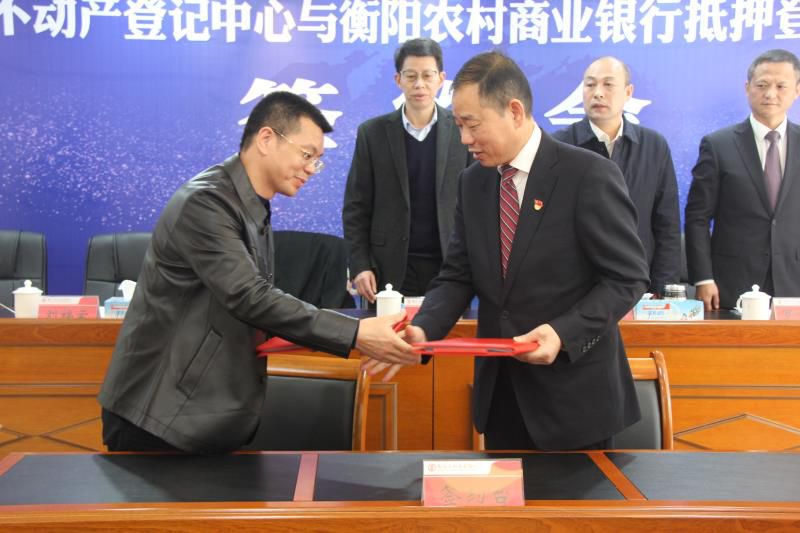 近日,衡阳市不动产登记中心与衡阳农商银行签订抵押登记便民服务协议,并在衡阳农商银行华新支行设立全市首个不动产抵押登记便民服务点,实现抵押登记“一窗受理、一站办结”。