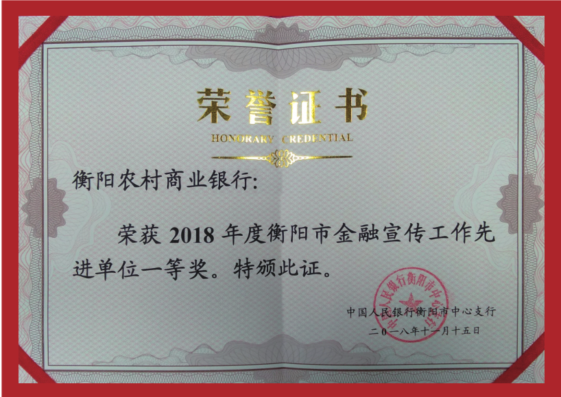 近日,中国人民银行衡阳市中心支行对2018年度全市银行系统信息工作先进单位进行表彰,衡阳农商银行荣获2018年度衡阳市金融宣传工作先进单位一等奖。