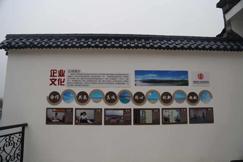 绕过阅览室旁边的侧门,豁然开朗,粉墙黛瓦加青铜栏杆的围墙把露天健身室与沅水巧妙连接,围墙的最右边被设计成了一片大的文化墙,公司简介、古城全貌、活动照片、地方书画全部上墙,与里侧花坛的几株竹子相映成趣。支行员工既能在这里活动健身,又能在这里欣赏风景、感受古城文化。