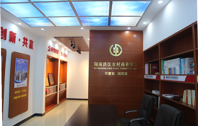 党员活动室旁边的阅览室已全部完工,进门的右边是一面木质的书柜墙,各式书籍整齐排列,正中间湖南洪江农村商业银行的标识时尚大气,左边则是一面木质的荣誉墙。最引人注目的是用一整片蓝色灯光装饰的天花板,能有效缓解看书后引起的视觉疲劳。