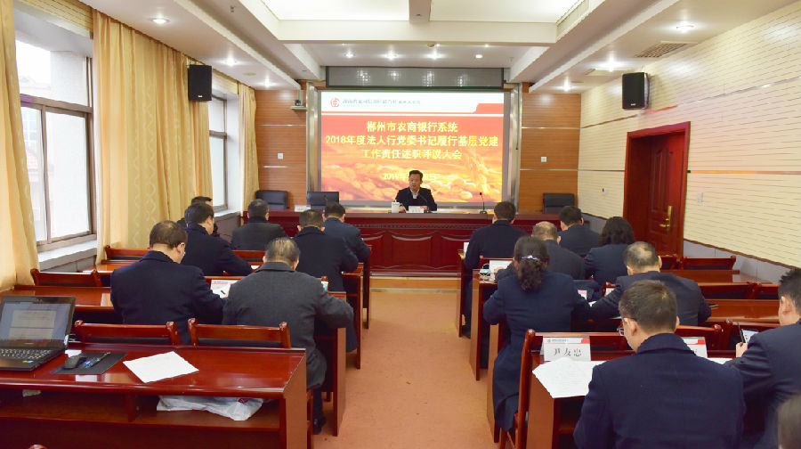 为进一步压实基层党建工作责任、严肃党内政治生活,1月18日,郴州办事处组织召开全市农商银行系统2018年度法人行党委书记履行基层党建工作责任述职评议大会。市办事处党组书记、主任高仕贤主持会议,党组成员、副主任周德湘,副处级督导员肖帆出席会议。