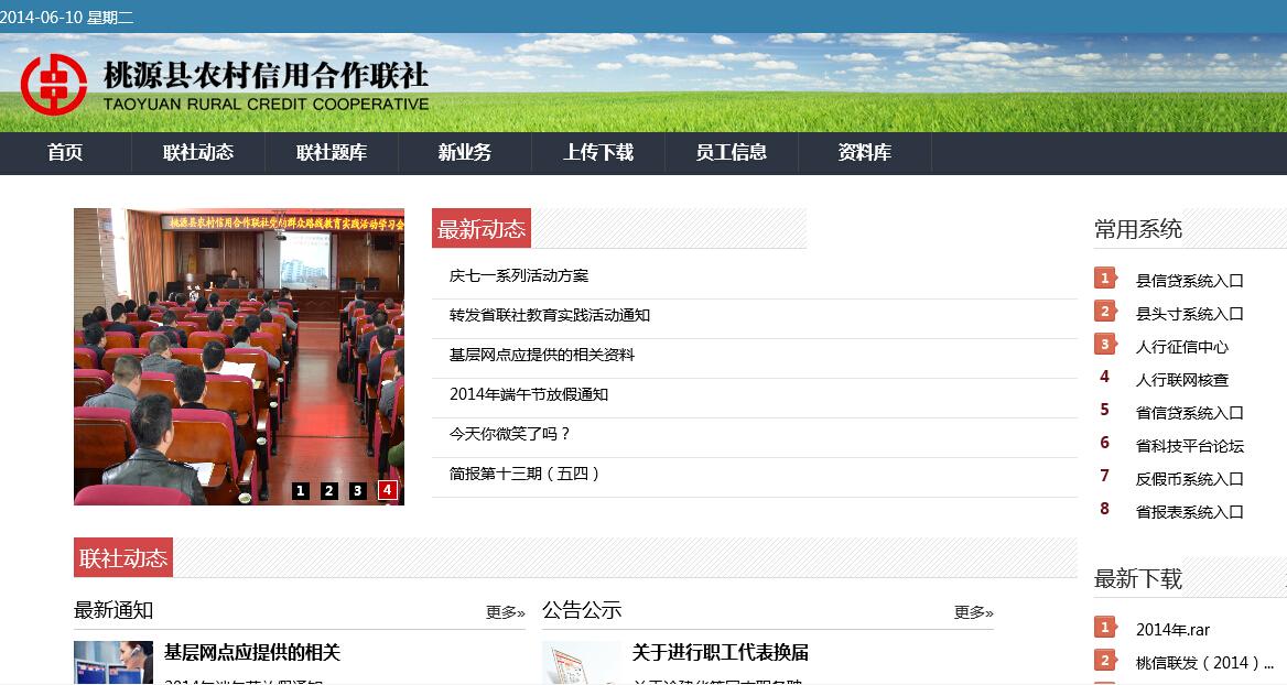 该社新综合信息办公平台以发布动态公告、业务交流学习、上传下载、归口系统链接为重点,合理整合资源,将县信贷系统入口、 人行征信中心、 人行联网核查、 省信贷系统入口、 省科技平台论坛、 反假币系统入口、 省报表系统入口统一纳入平台系统;科学设计栏目,根据需要设置联社动态、联社题库、新业务、上传下载、员工信息、资料库等模块;页面简洁明亮,旨在打造一个便捷、实用、安全的基层内部办公平台。