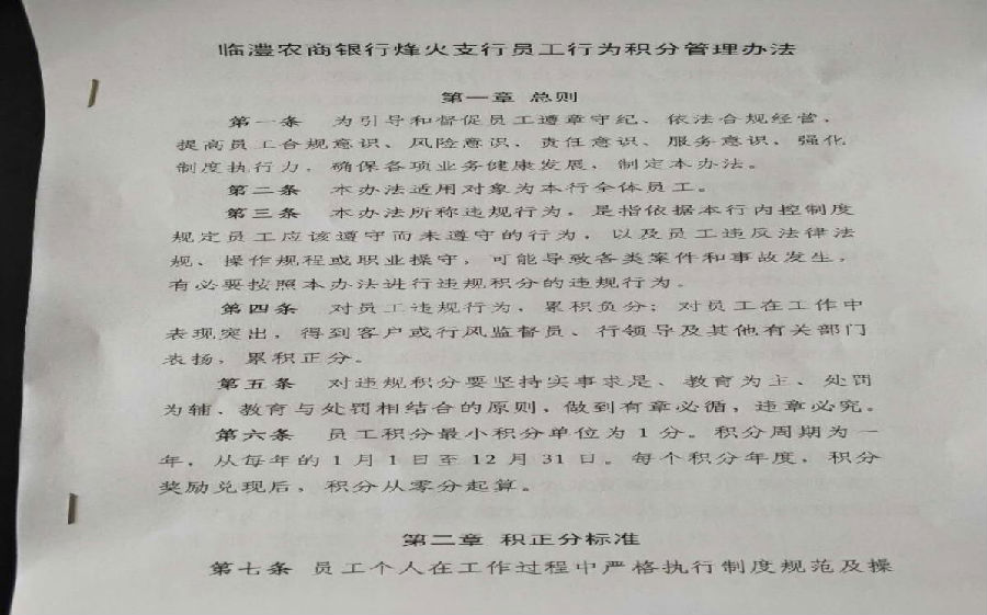 该办法明确了积正、负分的具体标准及运用规则。对员工在工作中表现突出、严格执行制度规范有关规定,或得到客户、行领导及其他有关部门表扬的,累积正分。对员工违反上班考勤、优质服务、安全保卫等相关制度或基础工作不到位的,累积负分;年度内的正负积分,可以相互抵消。同时,将积分与业务指标任务挂钩,超额完成或未完成的,按照一定标准给予积正分或负分。积分结果与员工的年终奖金、年度考核、评优评先挂钩,做到奖惩结合,激发干事动力。