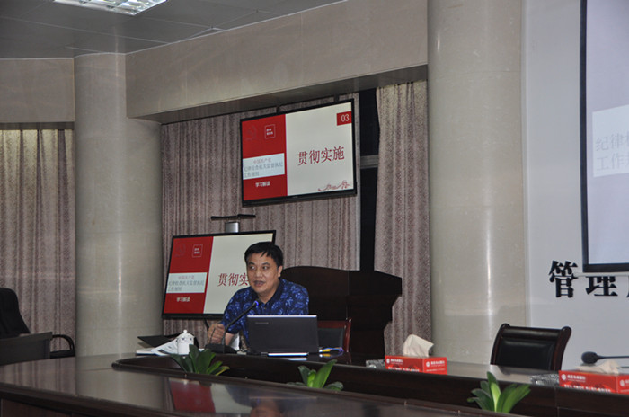 随后纪委书记、监事长邓炳元结合自己多年的工作实践、研究和思考,通过案例剖析深入浅出地为参会人员作了党风廉政建设案件警示教育培训。通过以案说纪、以案说规的形式,教育和引导广大干部员工要自觉抵制各类诱惑,严守廉洁从业底线,并强调要从通报的案例中汲取教训,举一反三,持之以恒,坚决杜绝类似的违规行为发生。