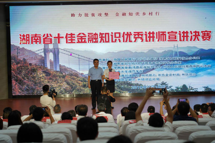 6月18日晚,由中国人民银行长沙中心支行、省互联网信息办、省农业农村厅、省扶贫办共同主办的“助力脱贫攻坚 金融知识乡村行”活动暨湖南省“十佳”金融知识优秀讲师宣讲决赛在吉首大学师范学院举行,吉首农商银行选派的刘子佳力压群雄,从全省各家金融机构经初赛、复赛层层选拨的10名选手中脱颖而出,荣获第一名。